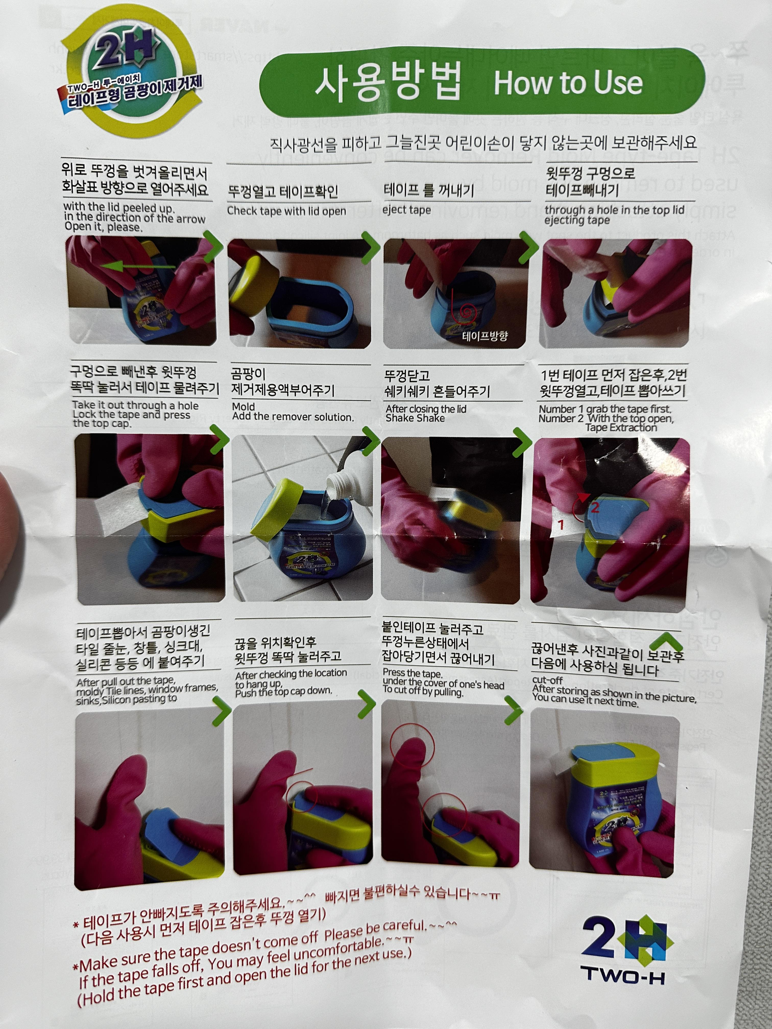 간단하게 설명드리자면 흰 통에 든 용액을 테이프든 파란 통에 넣고 흔들었다가 곰팡이 핀 곳에 붙혀주면 끝!!