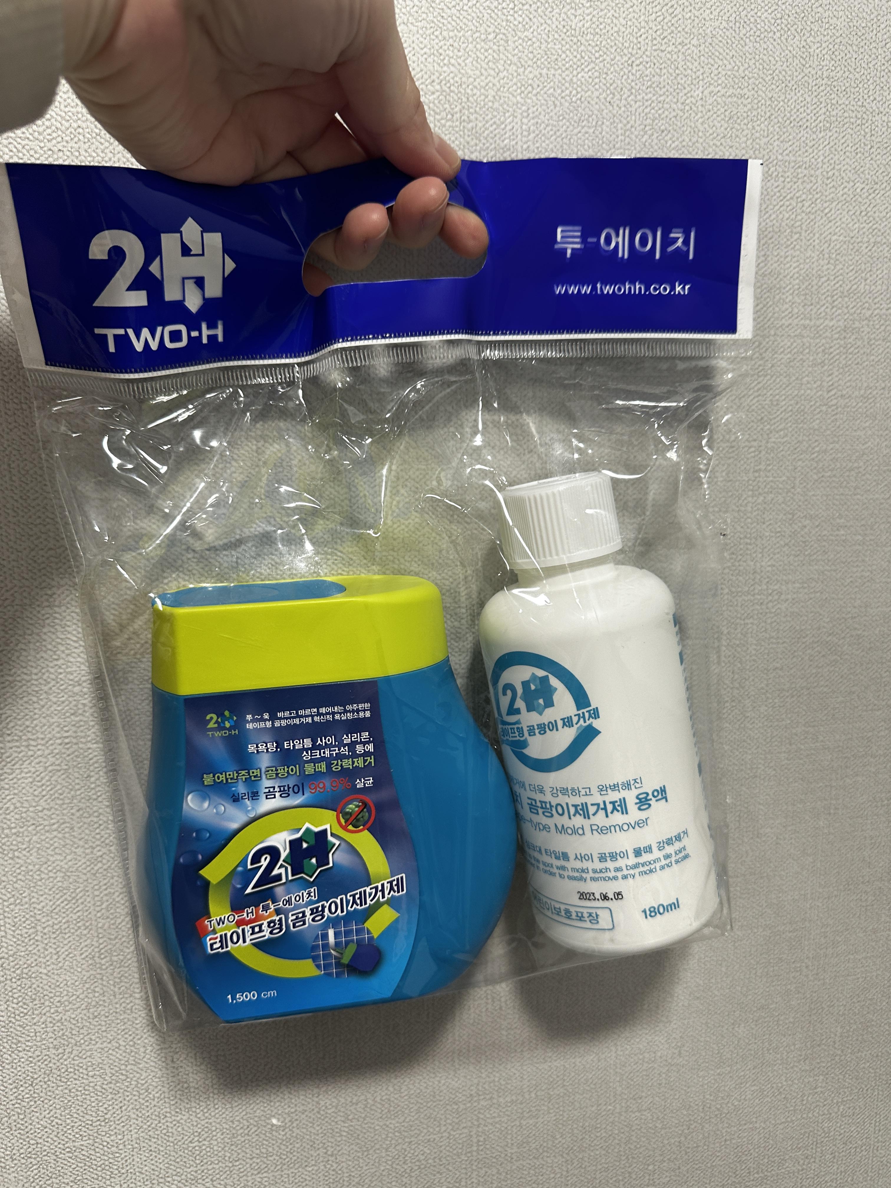 일단 투에이치 곰팡이제거제는 요렇게 두개가 세트로 되어있는데요 딱봐도 하나는 테이프고 하나는 용액입니다